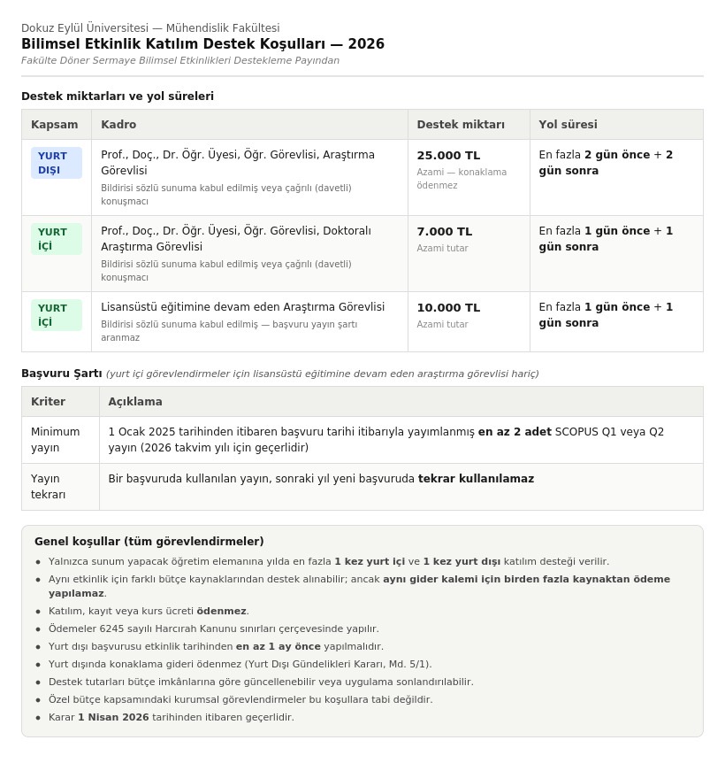 Bilimsel Araştırmaları Destekleme Payından Öğretim Elemanlarına Bilimsel Etkinliklerde Verilecek Destek Miktarı ve Yol Sürelerine Dair Fakülte Yönetim Kurulu’nun 30.03.2026 tarih ve 15/07 sayılı kararı
