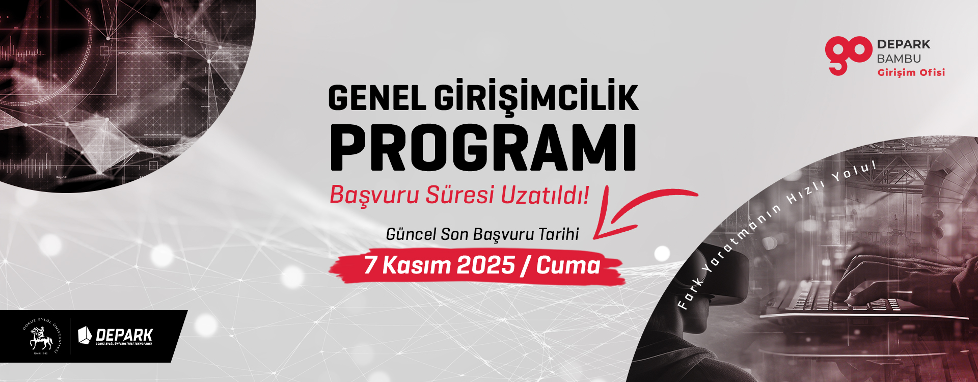 Dokuz Eylül Üniversitesi Teknoparkı (DEPARK) ve Teknoloji Transfer Ofisi (DETTO) yürütücülüğünde; Genel Girişimcilik Programı ön başvuruları başlamış olup, Üniversitemiz öğretim elemanları ile ön lisans, lisans, yüksek lisans ve doktora öğrencileri, deparkbambugo.com adresinden detaylı bilgiye ulaşabilir ve 7 Kasım 2025 tarihine kadar başvuru formunu doldurarak ön kayıt yaptırabilirler.