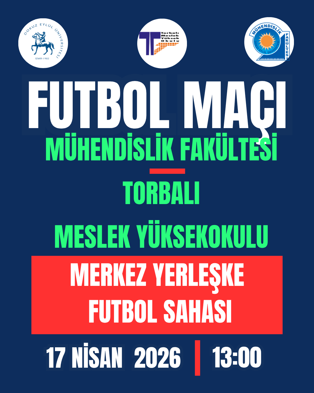 17 Nisan 2026 Cuma günü, Saat :13:00’de Merkez Yerleşke Futbol Sahasında Fakültemiz ile Torbalı Meslek Yüksekokulu arasında yapılacak olan karşılaşmada takımlarımıza sportmenlik ve dostluk içinde bir müsabaka diliyor, öğrencilerimizi, akademik ve idari personelimizi Merkez Yerleşke Futbol Sahasına davet ediyorum.