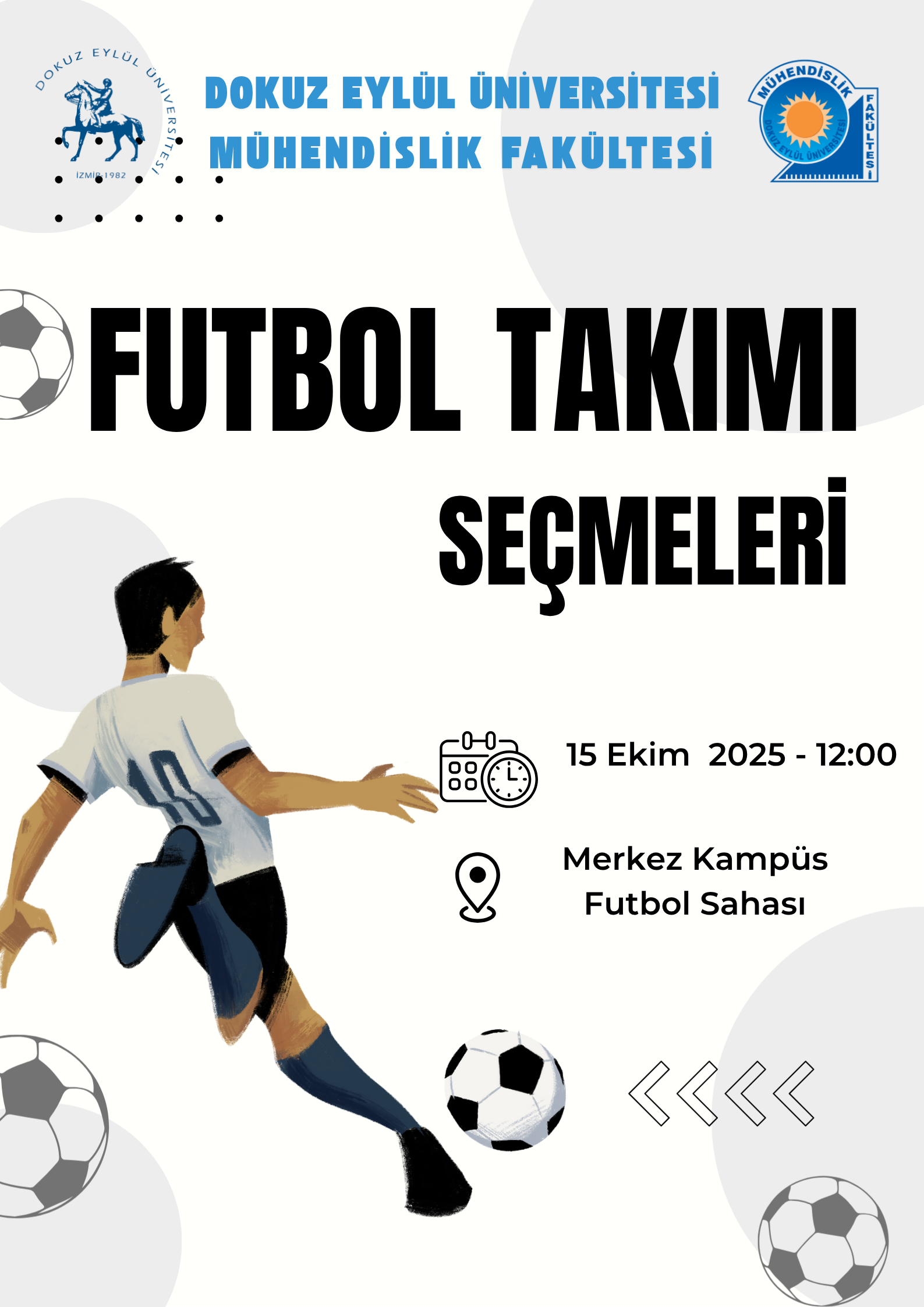 15 Ekim 2025 Çarşamba günü, saat 12:00’da, Merkez Kampüs Futbol Sahasında Mühendislik Fakültesi Futbol Takımı Seçmeleri yapılacaktır.