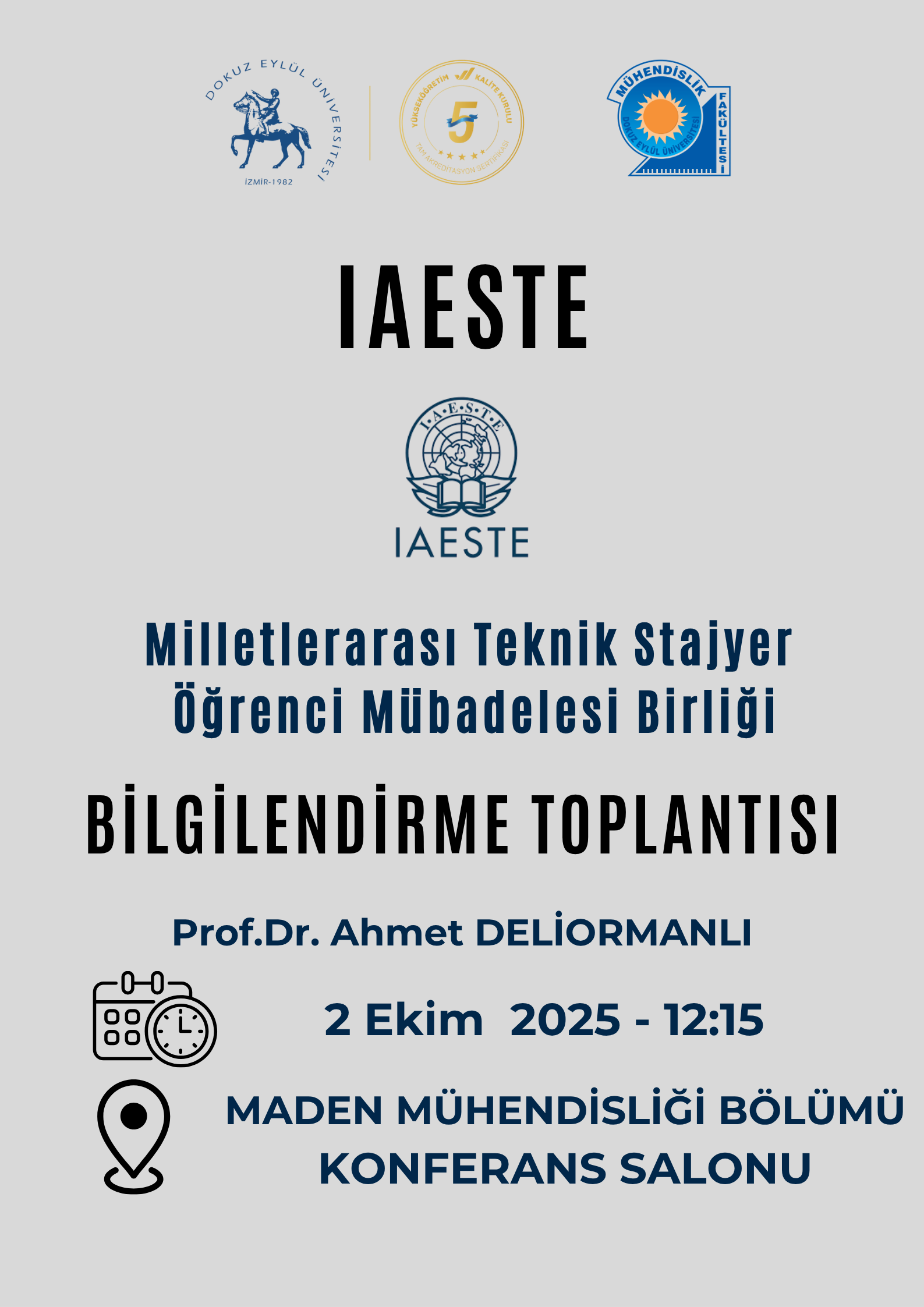 Maden Mühendisliği Bölümü öğretim üyesi Prof. Dr. Ahmet Hamdi DELİORMANLI, Üniversitemizin de üyesi olduğu IAESTE (Milletlerarası Teknik Stajyer Öğrenci Mübadelesi Birliği) konusunda Fakültemiz öğrencilerini bilgilendirmek amacıyla 02 Ekim 2025 tarihinde saat 12:15’de Maden Mühendisliği Bölümü Konferans Salonunda toplantı gerçekleştirecektir.
