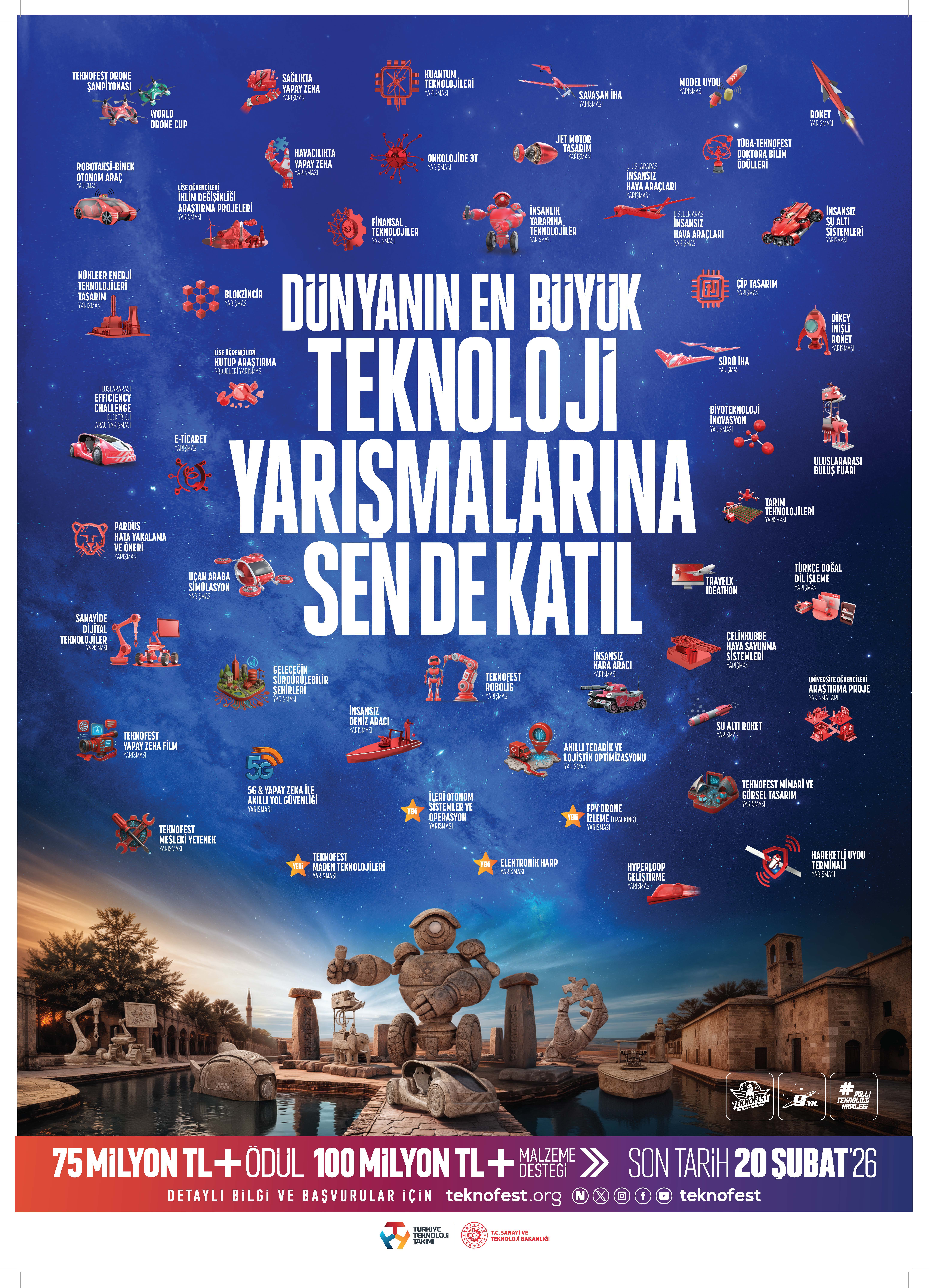 Dünyanın en büyük teknoloji yarışmalarına ev sahipliği yapan TEKNOFEST’te bu yıl 52 ana kategori 127 alt kategoride yarışmalar düzenlenecek. TEKNOFEST, teknoloji yarışmalarıyla 9. yılında da hayallerini gerçeğe dönüştürmek ve en iyisi olmak için mücadele eden gençlerin başarılı ve öz güvenli projelerine sahne olmaya devam ederken ön eleme aşamasını geçen takımlara 100 milyon TL’den fazla maddi destek, TEKNOFEST’te yarışıp dereceye girmeye hak kazanan takımlara da 75 milyon TL’den fazla ödül verilecek. TEKNOFEST 2026’da Roket, Model Uydu, Robotaksi Binek Otonom Araç, Savaşan İHA, Çip Tasarım, TEKNOFEST Mesleki Yetenek Yarışması, BlokZincir, Hava Savunma Sistemleri, Finansal Teknolojiler, İnsansız Deniz Aracı gibi gençlerin ilgiyle takip ettiği 52 farklı teknoloji yarışması düzenlenecek. 2025 Teknoloji Yarışmaları’ndan farklı olarak TEKNOFEST 2026 kapsamında TEKNOFEST Maden Teknolojileri Yarışması, Elektronik Harp Yarışması, İleri Otonom Sistemler Tasarım ve Operasyon Yarışması ve FPV Drone İzleme (Tracking) Yarışması ise ilk defa başvuruya açılacak. İlkokul seviyesinden ortaokul, lise, üniversite, lisansüstü ve mezun seviyesine kadar başvurulabilen, tamamı geleceğin odak alanlarında kurgulanmış yarışmalar hakkında detaylı bilgi sahibi olmak ve başvurunuzu gerçekleştirmek için www.teknofest.org adresini ziyaret edebilirsiniz. Son Başvuru Tarihi: 20 Şubat 2026! Hayalleri gerçeğe dönüştüren TEKNOFEST 2026 Teknoloji Yarışmaları’na sen de başvur, teknolojinin öncülerinden ol!
